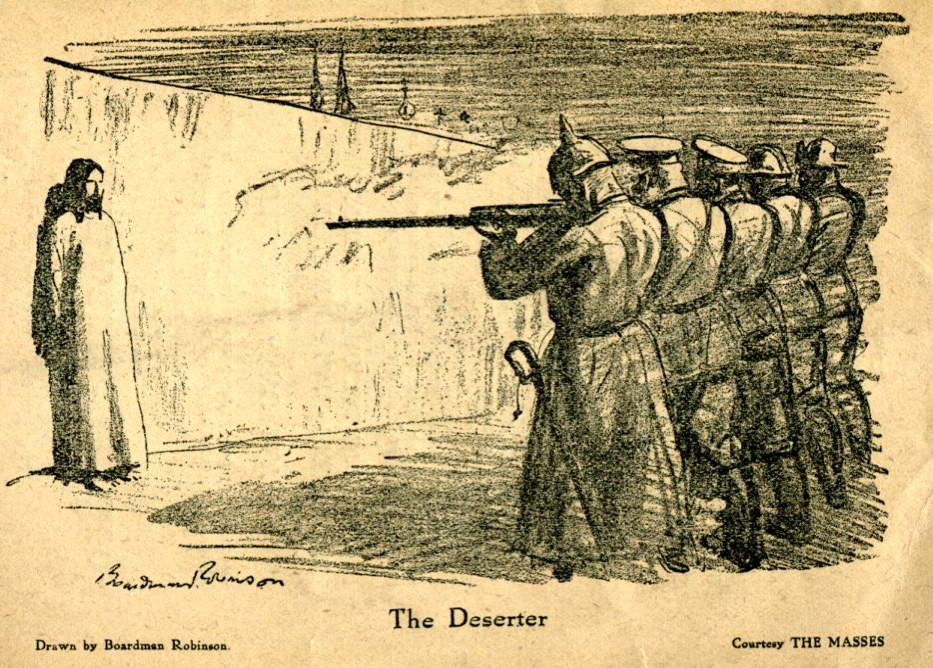На фото: Дезертир. Антивоенный рисунок, изображающий Иисуса перед растрельной командой, из солдат из пяти европейских стран, участвовавших в Первой мировой войне. Автор Бордман Робинсон, 1916