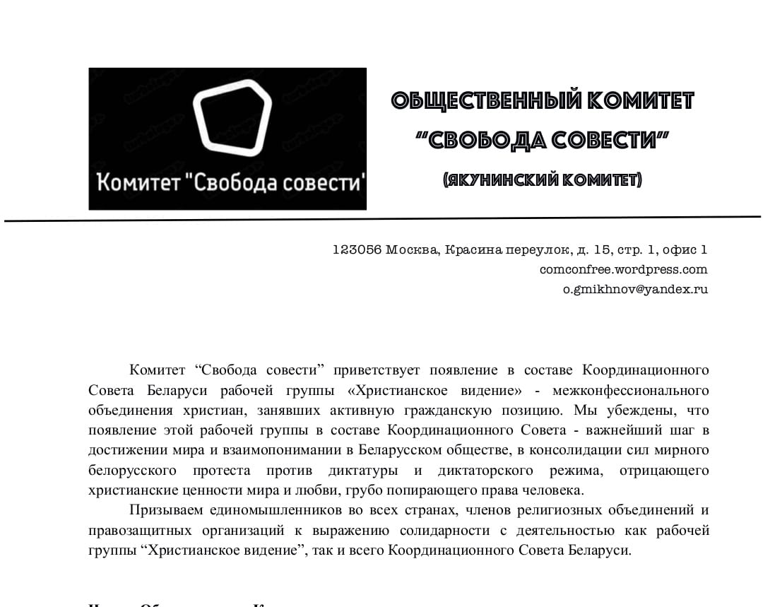 «Комитет “Свобода совести” приветствует появление в составе Координационного Совета Оппозиции [Республики Беларусь] рабочей группы «Христианское видение» — межконфессионального объединения христиан, занявших активную гражданскую позицию. Мы убеждены, что появление этой рабочей группы в составе Координационного Совета — важнейший шаг в достижении мира и взаимопонимании в Беларусском обществе, в консолидации сил мирного белорусского протеста против диктатуры и диктаторского режима, отрицающего христианские ценности мира и любви, грубо попирающего права человека.Призываем единомышленников во всех странах, членов религиозных объединений и правозащитных организаций к выражению солидарности с деятельностью как рабочей группы “Христианское видение”, так и всего Координационного Совета.